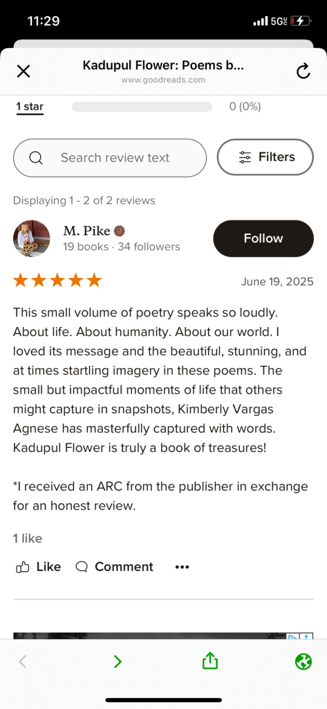 Several months ago, a Word Press friend and prolifically published author and blogger at https://mjeanpike.wordpress.com/2025/06/20/streak-a-mile-wide/ reached out to my publisher to ask for an Advanced Reader copy of Kadupul Flower. What a wonderful surprise to hear from my publisher that she had done this:)