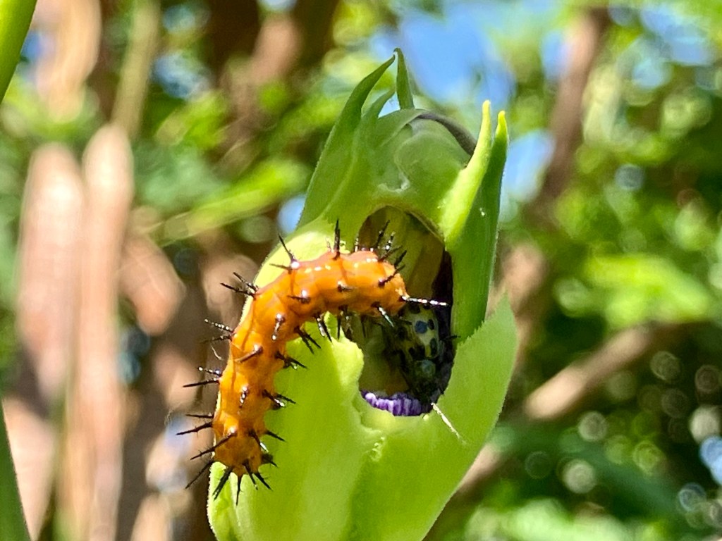Gulf Fritillary caterpillar enjoying a Maypop blossom:)